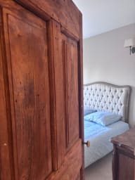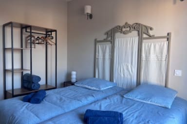 Upstairs, two elegant bedrooms provide a soft and restful atmosphere: one with a double bed and the other with two single beds, both offering convenient storage.